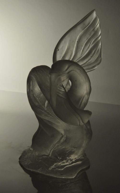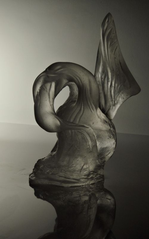 Phoenix is the mythical legend of the bird which beholds the capability of resurrecting itself. Bursting in flames, it turns into ash and passes away, giving place to the rebirth afterwards. The circulation of consuming the old self to generate the new is eternal and inevitable and appears in many spiritual teaching. Sometimes destroying is the key to create and enter a new stage of existence. It happens in nature as well as in our minds where we all go through similar changes time to time. I aimed to capture the ongoing process of the phoenix’s metamorphosis by the transcendency of cast glass. The two ‚self’ appear as two stages of being, showing the past and the future by a frozen moment in space. The composition is enriched by the alternations of the polished velvety surface with the glass’ many faces of roughness.